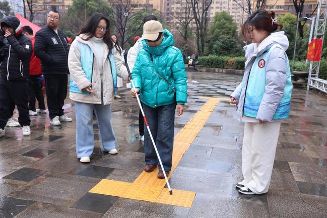 活动当天,志愿者们早早集结于栖霞区燕子矶街道山水苑小区,春寒料峭中,志愿者们以饱满的精神面貌为残障人士及社区居民提供良好的服务。为增进居民对视障群体的理解,社区组织“蒙眼行走盲道”体验活动。参与居民戴上眼罩,手持盲杖,沿社区盲道缓慢前行,志愿者们在旁协助、搀扶。短短几十米路程让体验者深刻感受到视障人士日常出行的不易,同时分享了自己亲身使用盲道和盲杖的深切体会,为推动无障碍设施的进步完善倾注心力,贡献宝贵力量。