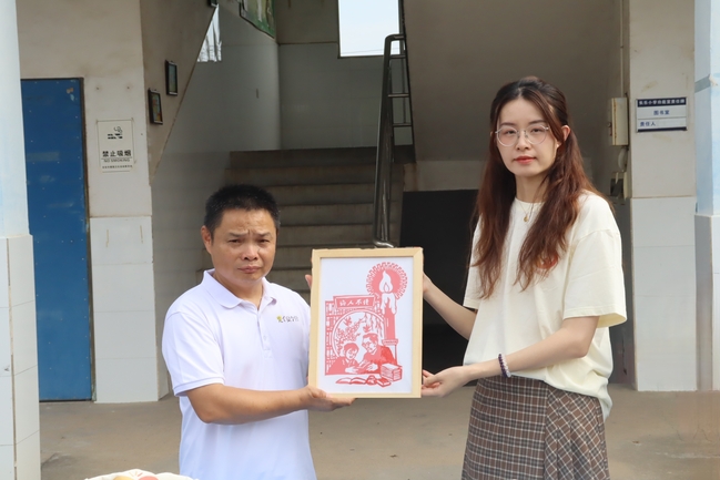 在开营仪式的高潮环节,“童心圆”团队指导老师余宛琳代表支教团队,向曲濑镇长乐小学赠送了一份极具文化内涵的礼物——由支教团队成员亲手制作的剪纸作品。长乐小学董事长王笃洪作为公司代表,郑重地接收了这份珍贵的礼物。这份剪纸作品以“诲人不倦”为主题,线条流畅而富有传统韵味,图案中融入了书卷、烛光等象征教育与传承的元素,寓意着教育的光辉与坚守。