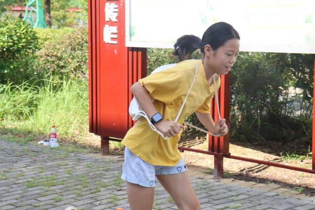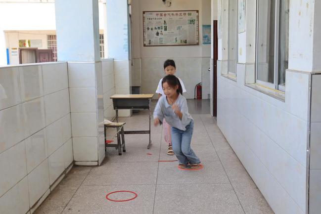 连续布置10个直径40厘米的圆环,便是危机四伏的“沼泽草地”。队员双脚并拢蛙跳前进,双足须同时落环;踩线或出圈即退回上一环重新开始,全队依次通过后视为穿越草地。不时有同学因踩线或出圈,被判“陷入沼泽”,需退回上一环重新开始。失误的孩子毫不气馁,立刻调整动作,下一跳更加谨慎,努力缩小跳跃幅度,确保双脚稳稳落在圆环中央。