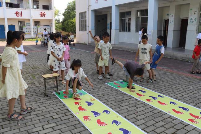每队五名队员纵向列队,按地面连续出现的“手掌”“脚掌”图标,队员们需统一用对应肢体拍地前行,动作必须同步连贯。哨声一响,“一二!一二!”号子声随即响起,整齐划一。当前方队员奋力前移,后方的队员立刻紧跟,队伍宛如一条蜿蜒前行的巨龙。当最后一名队员咬牙越过终点线,胜利的喜悦瞬间点亮了每一张通红的小脸。